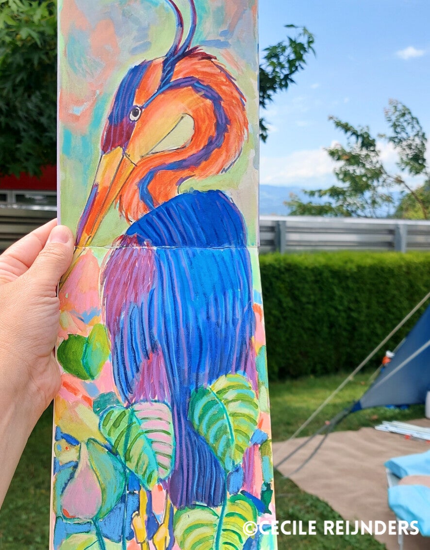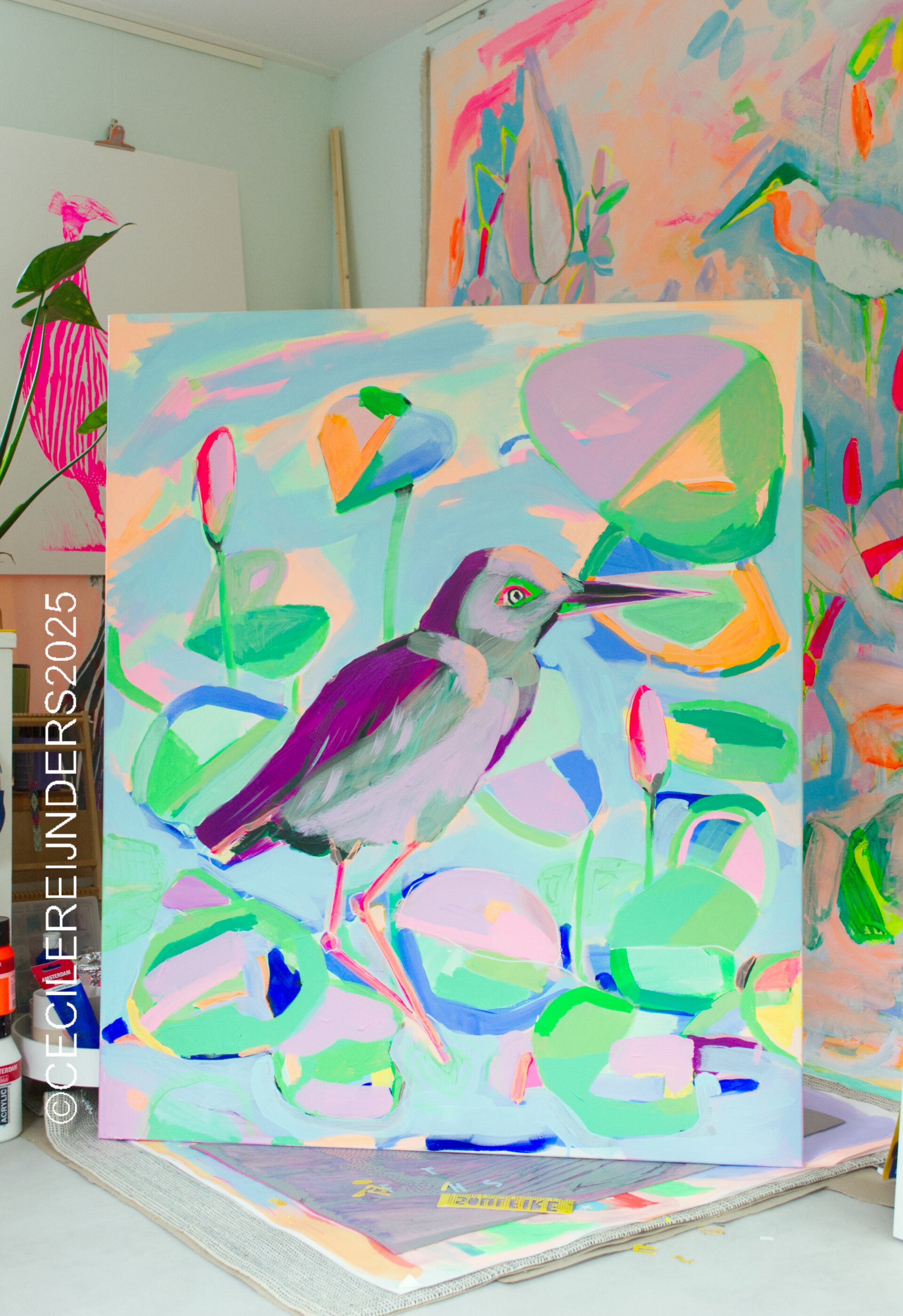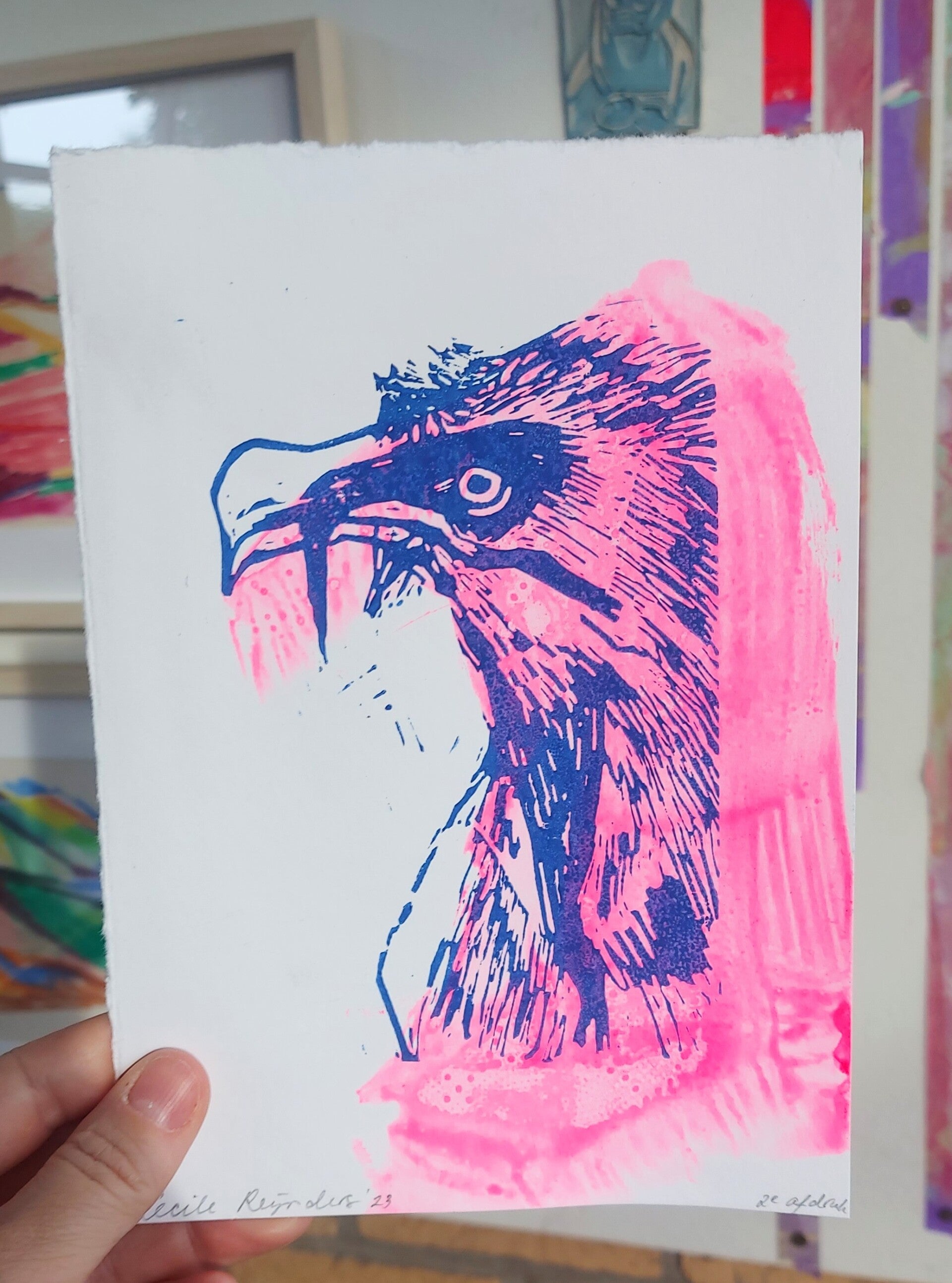 My birds come to life through the use of various materials and techniques. I create linocuts which I then hand-paint, and I combine drawing and painting on paper. More recently, I’ve also started working on canvas, which has further enriched my creativity.