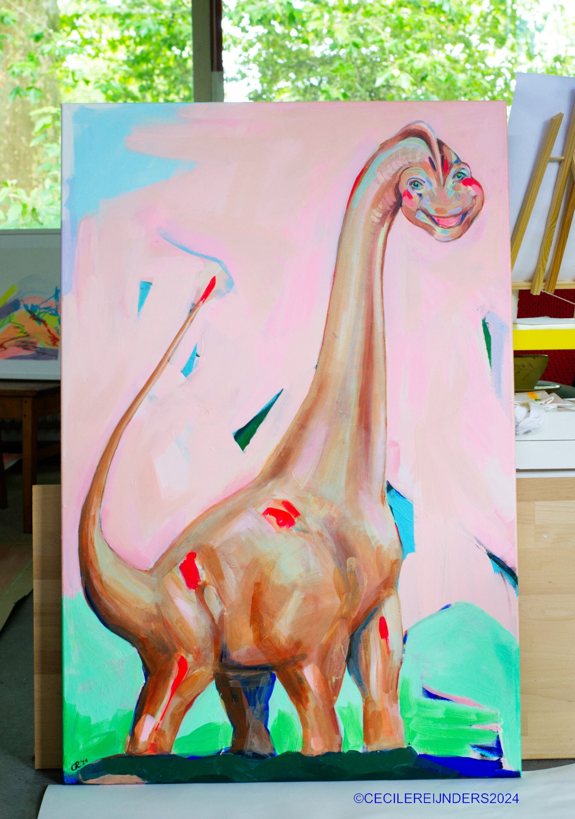 I created this dinosaur on commission for a child's bedroom. This Brachiosaurus has a very open, friendly, playful, and inviting appearance—greeting her every morning as she wakes up.